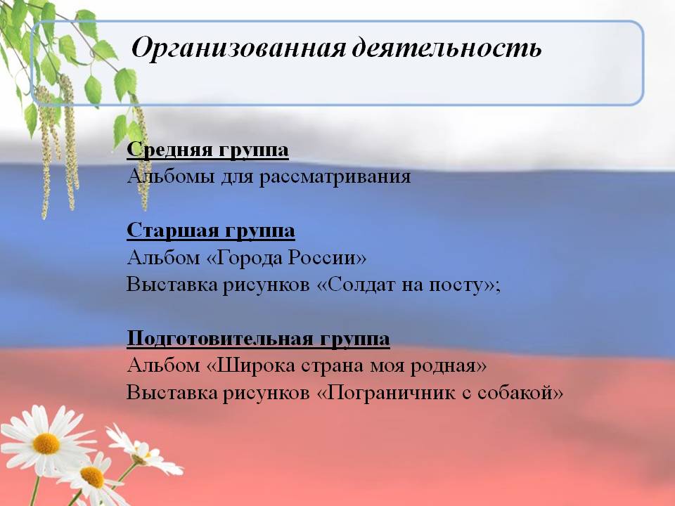 Знакомим с государственной символикой России, даём знания о стране, в которой мы живём (города, национальности, богатства нашей страны, народное творчество), знакомить с картой, глобусом, с праздниками .